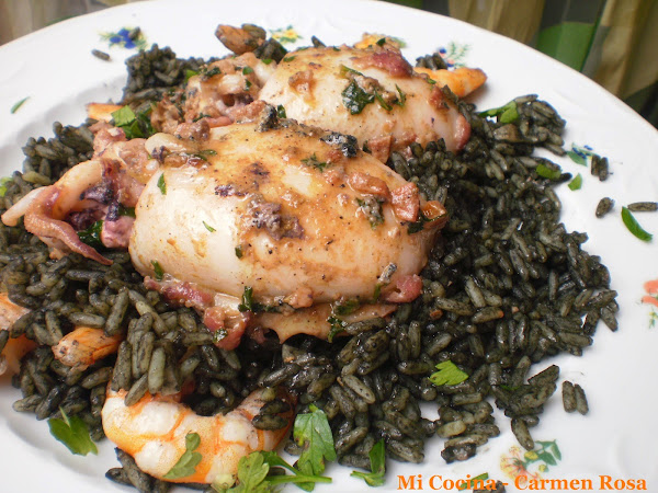 Agregar el arroz al sofrito y echar el caldo dejándolo cocer a fuego fuerte quince minutos, bajando el fuego para posteriormente dejarlo cinco minutos más cociendo; en éste momento agregar los langostinos al arroz (si ven necesario añadir un poco más de caldo éste deberá estar hirviendo a fin de no cortar la cocción del arroz) y colocar encima las jibias.