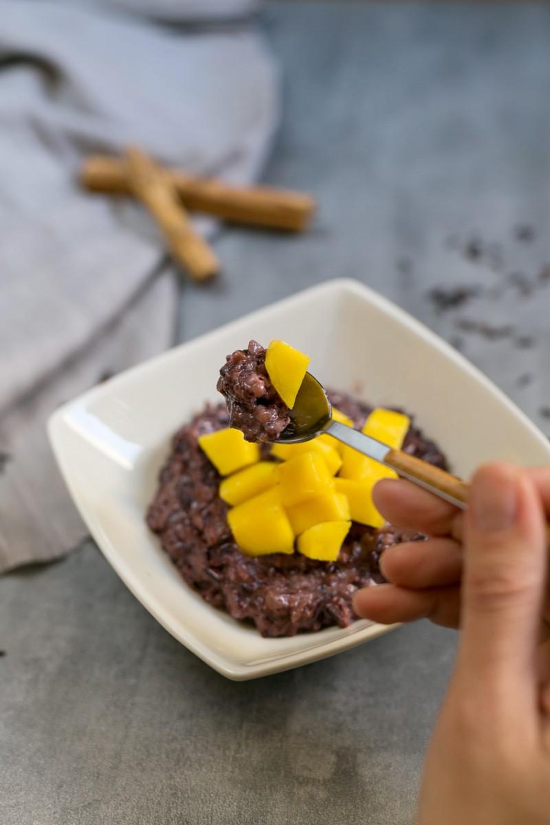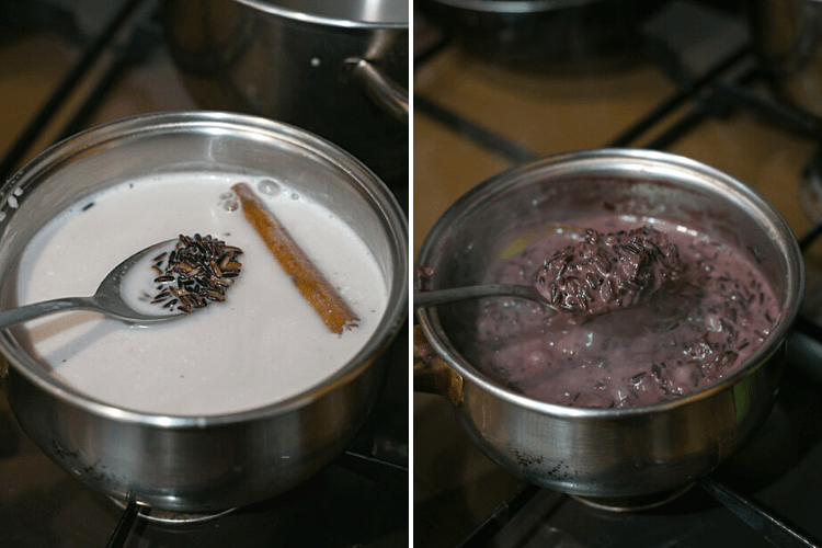 Mi versión es un poco diferente, ya que en esta oportunidad lo hice con arroz negro (un arroz rico en fibra, proteínas y vitaminas B1 y B2) que se consigue en almacenes tipo emporio, tiendas orgánicas y/o tiendas asiáticas. Pero puedes usar arroz integral o blanco sin problema. Y no es tan pegajoso como el original, si no un poco más cremoso (personalmente me gusta más así), pero con todo el sabor de la leche de coco que lo caracteriza.