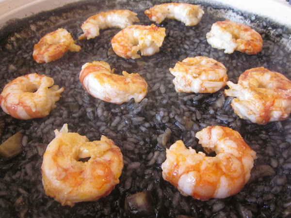 Para terminar, pasamos por una sartén los gambones, sazonados y a fuego fuerte y lo servimos encima del arroz negro, que acompañaremos con alioli.