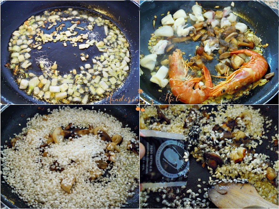 Eso es lo que hice con los restos de marisco....tenía 3 gambones, un par de sepietas pequeñas, un puñadito de puntilla, un táper de fumet de marisco, media bolsita de setas variadas......y también tinta, decidido, preparé un arrocito negro de marisco con setas.