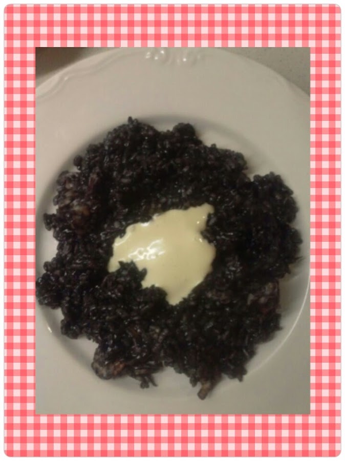 Vamos a hacer el sofrito de pimiento y cebolla. Cuando este bien blandito añadimos las gambas peladas (con las cabezas haremos un fumet) y las puntillas limpias. Cocinamos durante unos 5 minutos y añadimos la tinta, con un par de sobrecitos es suficiente. En ese momento echamos el arroz y mezclamos bien. Dejamos cocinar un rato y añadimos agua y el suquet de las gambas.