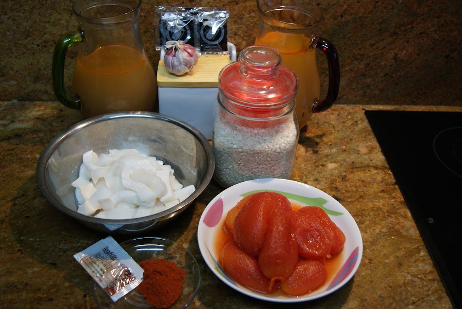 400 gr de arroz, 120 ml de aceite de oliva, 600 gr de sepia (yo he usado potón), 500 gr de tomate pelado (he usado de lata), 1 cucharada sopera de pimentón, 4 bolsitas de tinta congelada, 1 cabeza de ajos pelada y una pizca de azafrán.. 1 L o un poco más de caldo de pescado.
