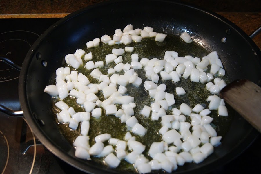Empezamos poniendo una paellera al fuego con el aceite y cuando esté caliente echamos la sepia cortada a trocitos pequeños.