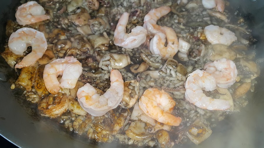 Pasado ese tiempo añadimos los langostinos y apagamos el fuego. Dejamos el arroz otros 5 minutos sin fuego y los langostinos se cocinarán con el propio calor quedando al punto.