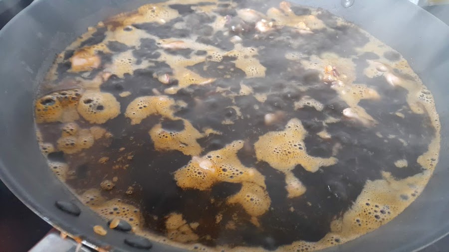 Añadimos el caldo, 3 vasos y medio (unos 800-900 ml), junto con el sobre de tinta y dejamos el arroz 18 minutos a fuego medio alto.