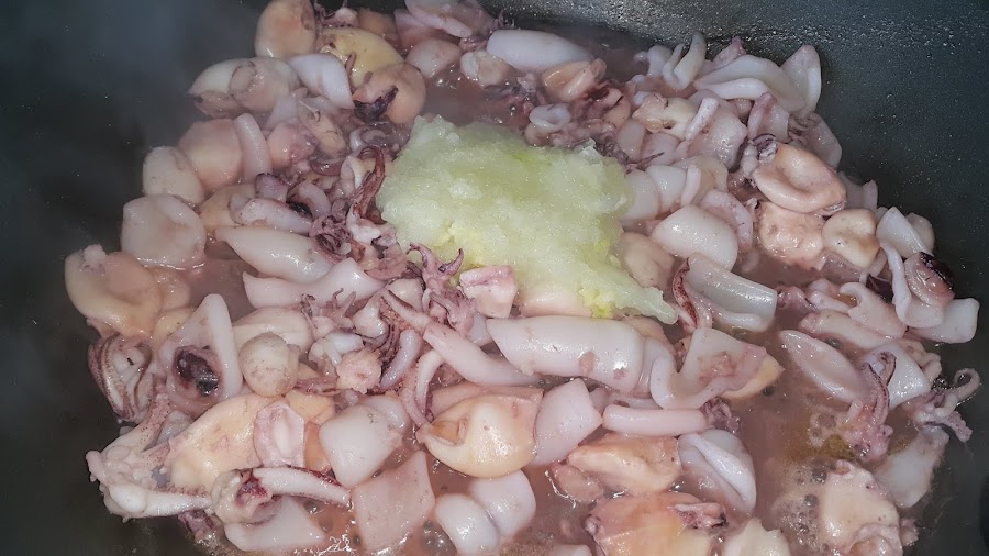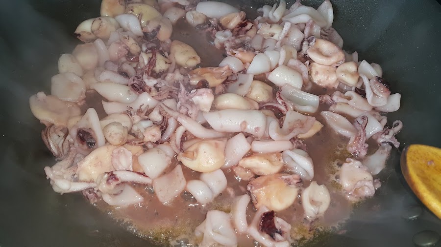 Lo primero que haremos será preparar los calamares y los chipirones. A mí me gusta limpiarlos del todo retirando vísceras y pieles. Los troceamos y los ponemos en una sartén amplia con un chorrito de aceite. Los dejamos hasta que se reabsorba todo el agua que hayan soltado.