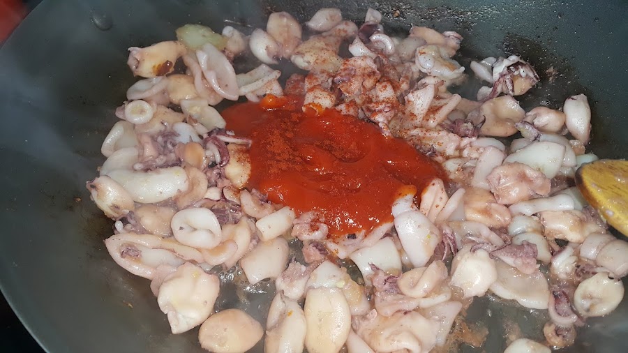 Pasados unos 5 minutos añadiremos las 4 cucharas de tomate concentrado y lo dejaremos tapado unos 10 minutos a fuego bajo.