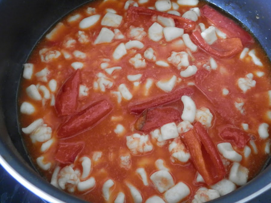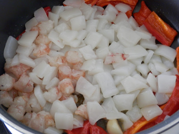 Cuando empiece a estar blandito el pimiento, añadimos el calamar troceado y los gambones también troceados.