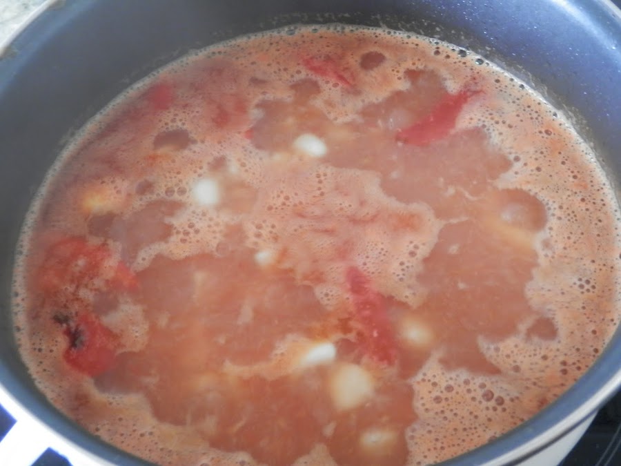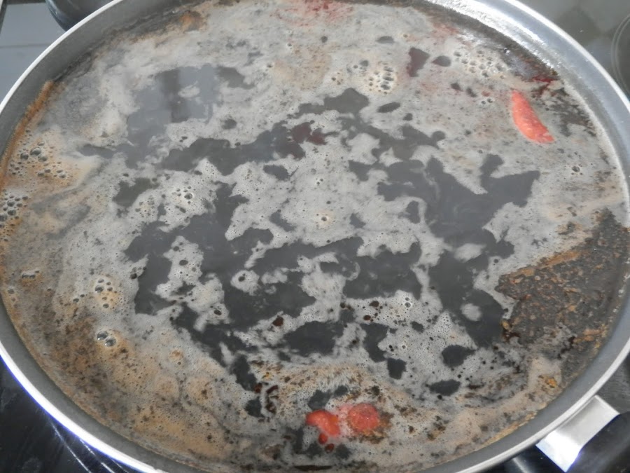 Ahora, colaremos el caldo que hemos hecho con las cáscaras y cabezas de los gambones y lo añadimos a la preparación.