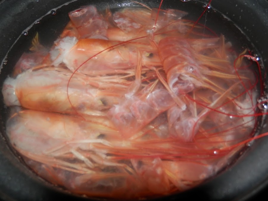 Pelamos los gambones y las cáscaras las ponemos en un cazo y cubrimos con agua.