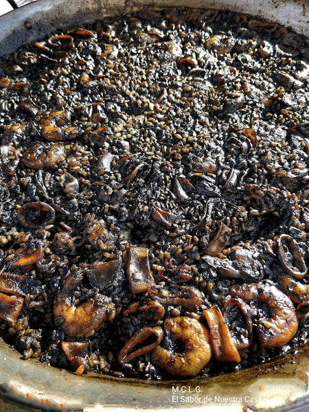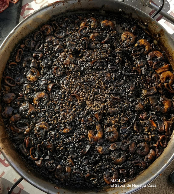 Cuando se ha cocinado el conjunto incorpora el arroz. Remueve durante 3 minutos. Añade el litro de fumet uniendo el de los langostinos y los mejillones con la tinta diluida en ellos y deja hervir 16 minutos el arroz. Añade un poco más de fumet si ves que se consume y queda el arroz algo entero. Cuando falten 10 minutos para terminar añade los langostinos pelados y los mejillones. Comprueba la cantidad de sal. Debe reposar unos minutos.
