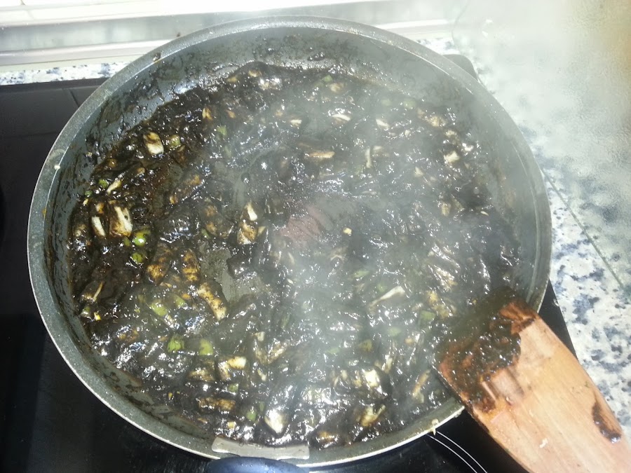 Cuando lo tengamos todo bien sofrito añadiremos la tinta y cocinamos bien para que no sepa a metal.