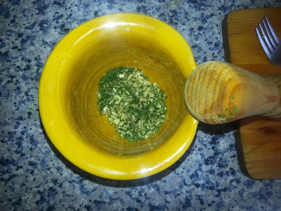 En un mortero machacamos los ajos picaditos y el perejil junto con la sal, y reservamos.