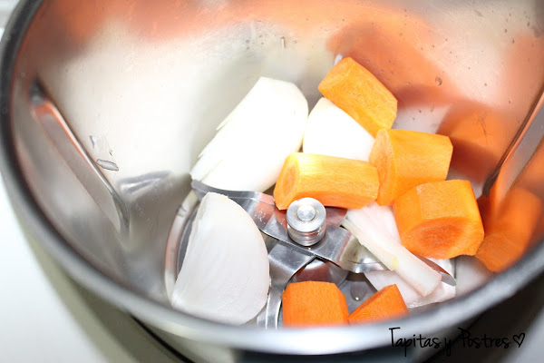 Primero hacemos el sofrito. Ponemos en el vaso la cebolla en cuartos y la zanahoria pelada en varios trozos y troceamos 5 segundos a velocidad 4.