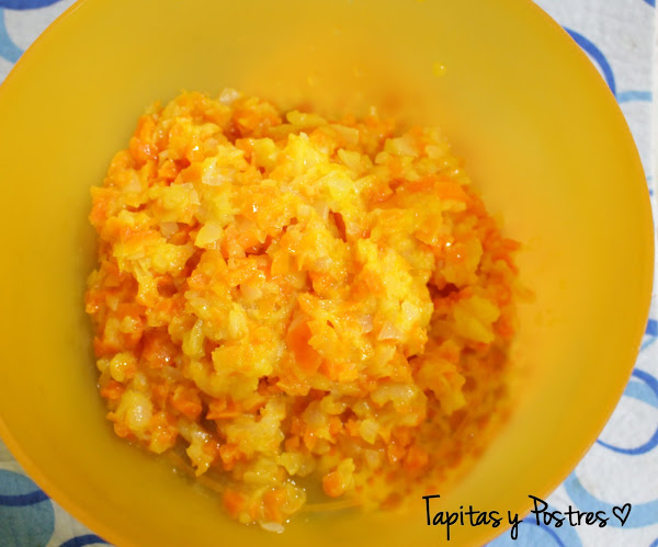 En una sartén amplia hacemos un sofrito con la cebolla y la zanahoria picadita. Cuando estén hechas, las apartamos y reservamos en un recipiente grande.
