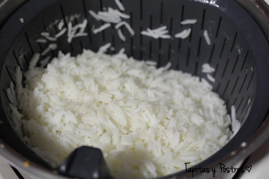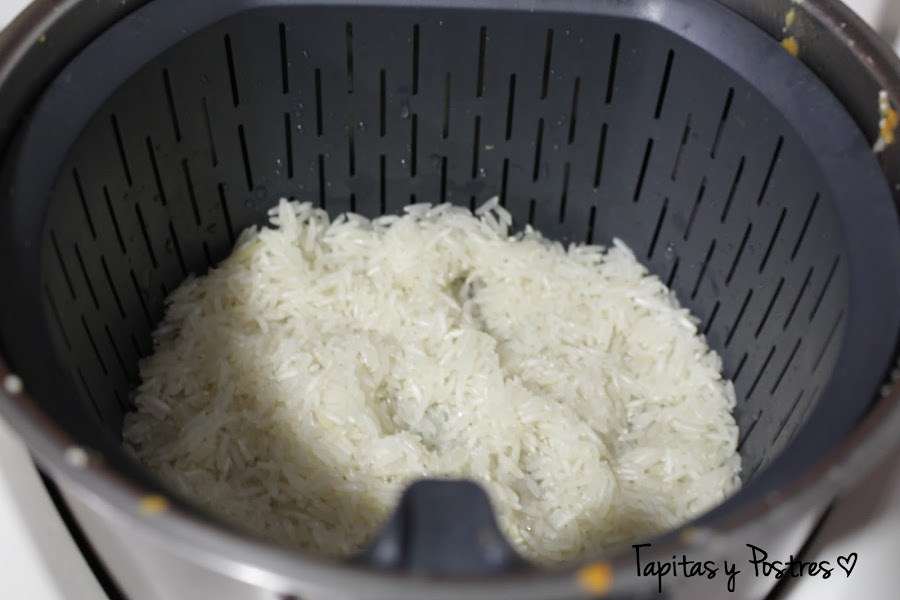 Ya está el arroz. Os recomiendo que a los quince o dieciocho minutos, paréis la máquina y probéis el arroz. Puede ser que ya esté listo. Una recomendación, Haced esta receta con arroz basmati o arroz largo, no con el de grano redondo. No queda igual. Escurrimos bien y mezclamos con el resto de los ingredientes.