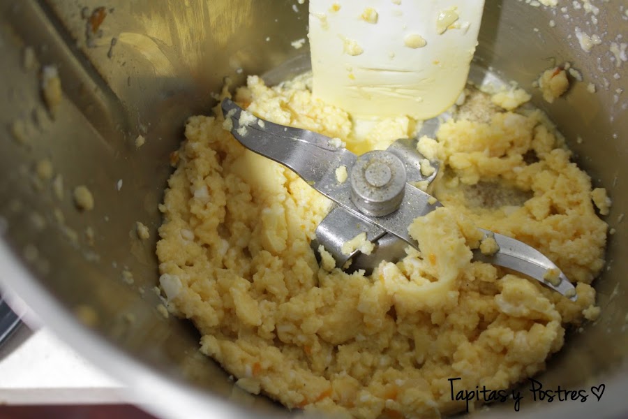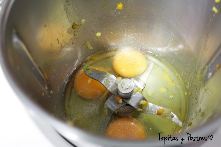 Para hacer los huevos revueltos, sin lavar el vaso, ponemos los huevos y la sal y programamos 8 minutos, varoma, velocidad 1. Cuando acabe el tiempo se programa 5 segundos en velocidad 5 y se vierte sobre el sofrito reservado.