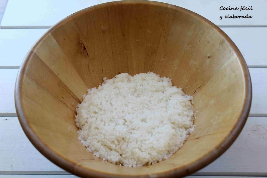 Ponemos el arroz en un recipiente ancho y añadimos unos 70-80 ml de aliño para sushi.