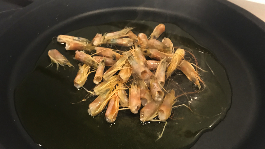 Dora las cabezas de los langostinos aplastándolas para que suelten su jugo y den sabor al aceite.