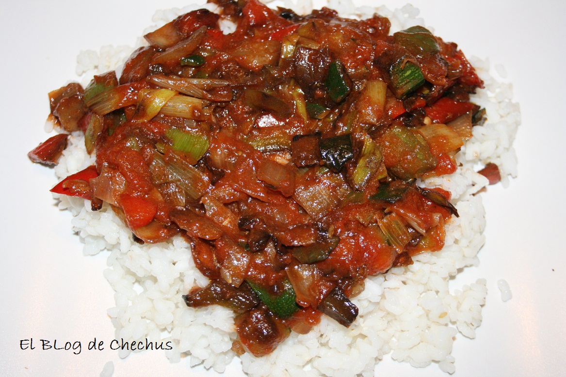 La elaboración es la siguiente Cocemos el arroz blanco con la hoja de laurel y reservamos escurriéndolo bien. Mientras en una sartén ponemos un poco de aceite y echamos la bolsa de verduras con un poquito de sal. Tapamos y lo ponemos a fuego lento removiendo de vez en cuando. Cuando veamos que está casi hecho le ponemos dos cucharaditas de curry, removemos y le ponemos el tomate frito. Dejamos terminar de hacer a fuego lento.