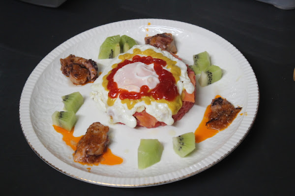 Hacía días que no cocinaba arroz, el otro día toco, opte por realizar un arroz a la cubana con variantes, aunque el plátano frito es muy apreciado por muchos paladares, en casa, lo preferimos crudo, opte por comenzar realizando un arroz diferente, añadiéndole unas pasas y colorante rojo, el cual una vez emplatado con la ayuda de un molde, lo cubrí con una loncha de salmón ahumado, el habitual huevo frito, decorado con kétchup y mostaza, para decorar el plato un kiwi a daditos y una lata de rodajas de pota (parecido al pulpo en lata).