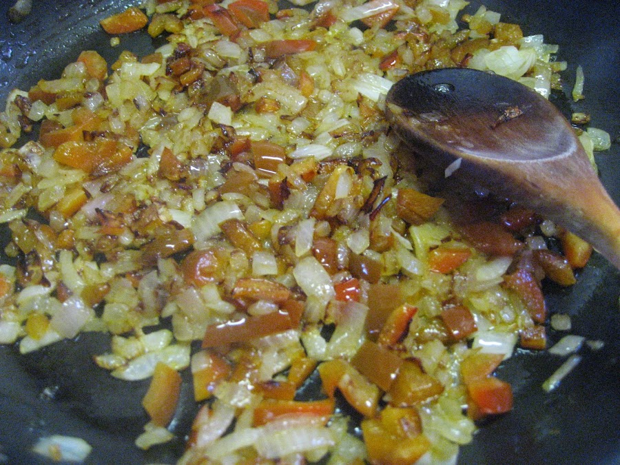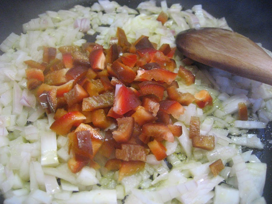 1º " Cortamos la cebolla y el pimiento en trozos pequeños (brunoise), más o menos, lo ponemos en la sartén o en una paellera y lo sofreímos todo, hasta que quede dorado.