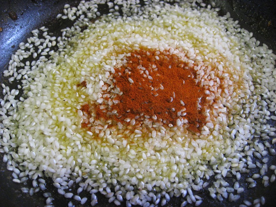 3º " Pasamos el arroz por la sartén donde hemos hecho el sofrito y los calamares, le damos unas vueltas para que pueda aromatizarse, le añadimos el pimentón que teñirá el arroz (Rojo).