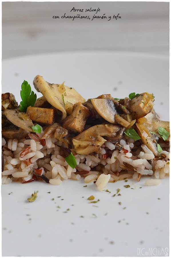 Primero hacemos el sofrito de los champiñones, dorando media cebolla a la que añadimos 10 champiñones cortados en láminas, y echamos todo conjuntamente para acabar añadiendo unas láminas de jamón finas, y unos cuadraditos de tofu previamente hidratados con salsa de soja. Por último añadimos un ajo cortado muy finito