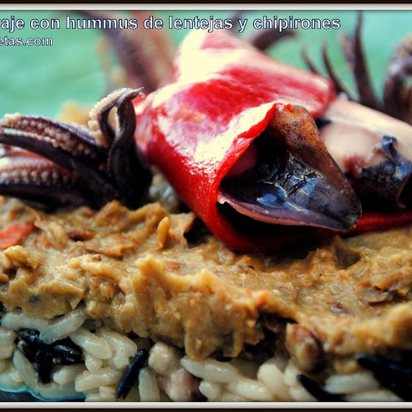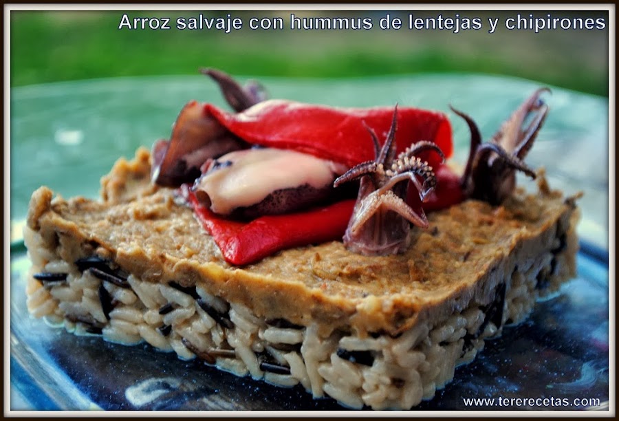 Ahora armas el plato haciendo una cama con el arroz (pones un molde y lo aprisionas bien para que quede firme), le untas una capa del hummus de lentejas, ahora rellena los pimientos de piquillo con los chipirones, adornas a tu gusto y sirves, acompáñalo con un vino blanco con cuerpo, para realzar los sabores, verás que está delicioso!!