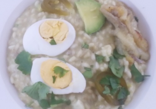 -Colocar en un plato sopero el risotto, poner una lámina de aguacate, dos rodajas de huevo duro, cilantro, tres rodajas de jalapeño y la ralladura de limón. Yo también la añadí un poco de plátano frito.
