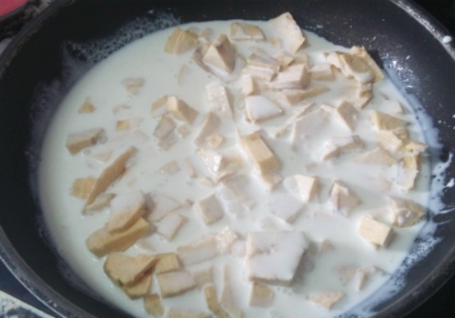 Después de la primera tanda se añade el puré de plátano. Este puré de plátano se hace así: se pone el plátano macho en cubitos en la sartén e inmediatamente la nata (crema de leche). Yo también le añadí un buen chorro de leche porque se quedaba muy seco y el plátano no se ablandaba ni a la de tres.