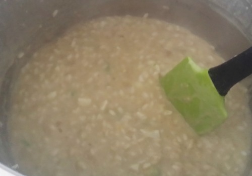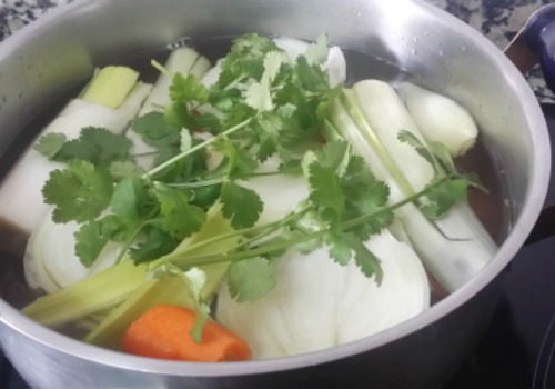Hacer un caldo con cebolla, zanahoria, puerro y el cilantro. Añadir sal. Dejar cocer hasta que las verduras estén blandas. Una media hora.