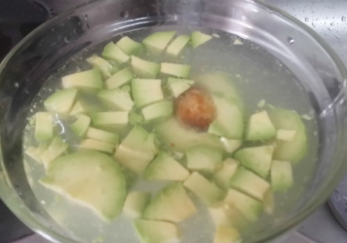 1 Aguacate en cubos. Guardan con agua y limón para que no se ennegrezca.