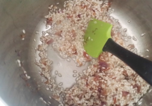 En una olla, poner aceite y sofreír la cebolla morada. Cuando esté bien rehogada se añade el arroz y dejar que se dore.