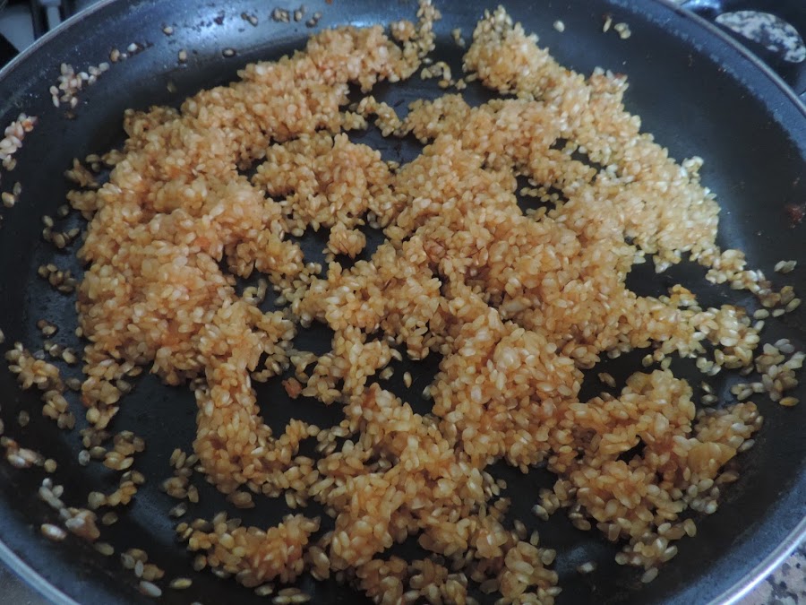 En el mismo aceite de haber frito el bogavante, fries dos ajos troceados finamente, añadir el tomate triturado con un poco de sal, cuando ya esté todo bien sofrito, añades el arroz y le das unas vueltas para que se sofría también, echar un poco de pimentón y darle unas vueltas que no se queme.