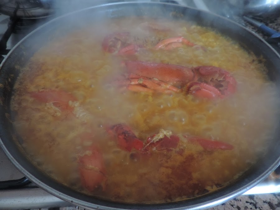 Agregar el caldo bien caliente a la paella, añadirle unas hebras de azafrán y rectificar de sal, dejar cocer el arroz a fuego bajo unos diez minutos, sin remover el arroz. Pasado ese tiempo más o menos poner los bogavantes sobre el arroz, con la carne hacia abajo y deja cocinar hasta que esté hecho el arroz.