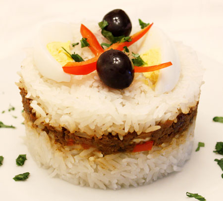 En una sartén dorar el ajo y la cebolla picados. Agregar el ají y la carne molida. Cocinar, sazonar. Añadir el orégano, las pasas y las aceitunas picadas. En un recipiente aceitado, echar la mitad del arroz blanco, bien apretado. Colocar el relleno y tapar con la otra mitad del arroz. Apretar bien. Sacar el molde con cuidado. Espolvorear el molde de arroz con queso parmesano. Decorar con rodajas de huevo duro y una aceituna.
