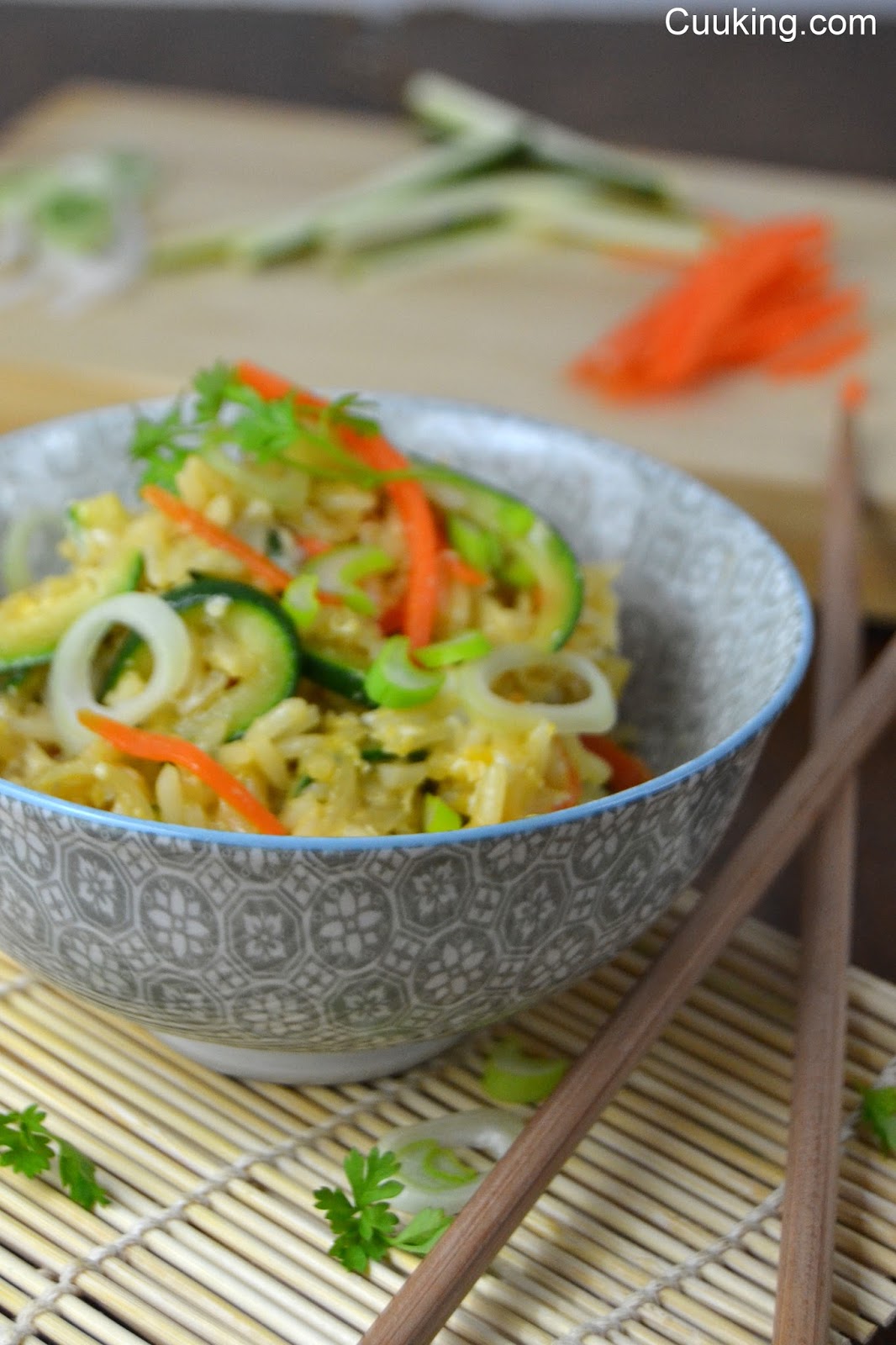 2.- Mientras e cuece el arroz preparamos las verduras. Cortamos la parte de verde de la cebolleta, el calabacín y la zanahoria en juliana. Tiene que ser de uno 2-3mm de ancho para que quede en su punto. A la parte verde mas cercana al bulbo de la cebolla le quitamos la capa exterior y cortamos a rodajas, esto nos servirá de decoración.