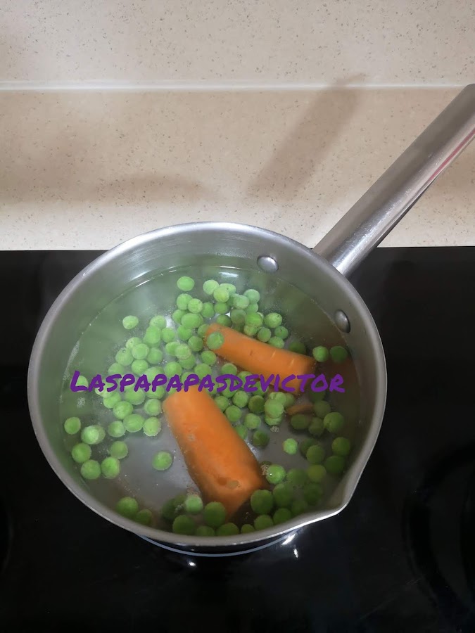 Hervir junto los guisantes y la zanahoria pelada y cortada a trocitos o sino después a la que esté bandita