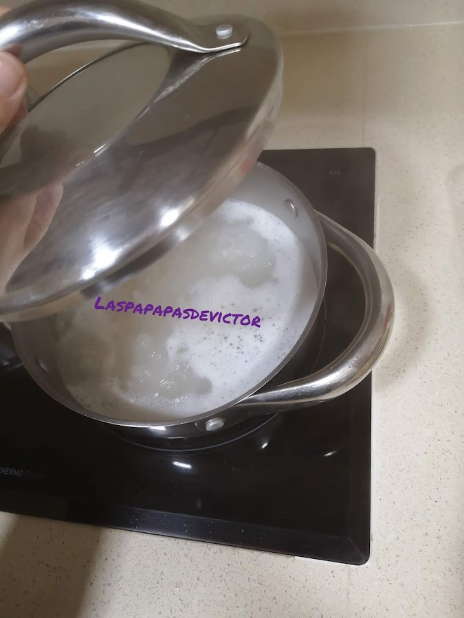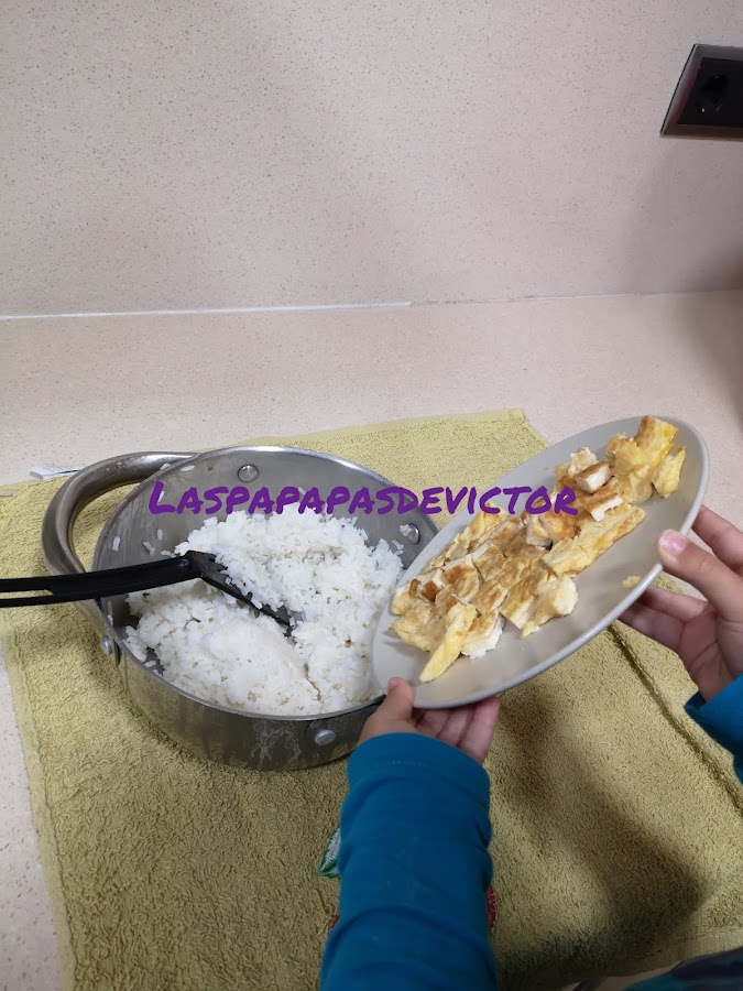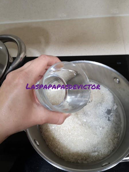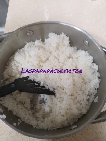 Poner a hervir el arroz, previamente lavado para quitar el almidón durante 12 min y después dejar reposar tapado 12 min más