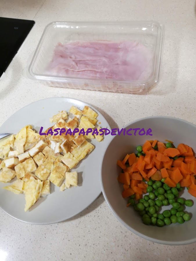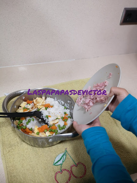 Solo queda meterlo dentro con el jamón York cortado a cuadraditos y mezclar