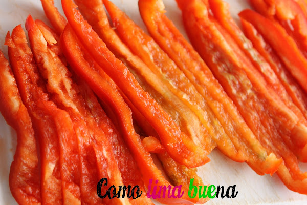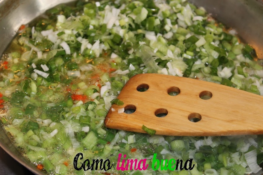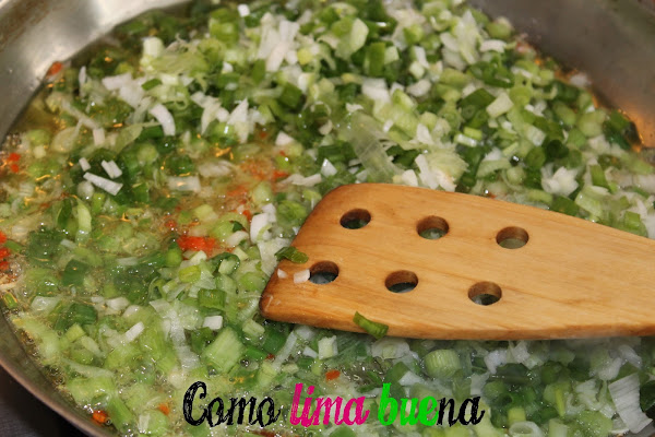 Calentar en una sartén un poco de aceite de oliva. A continuación saltar el ajo, el morrón, el chile y la cebolla.