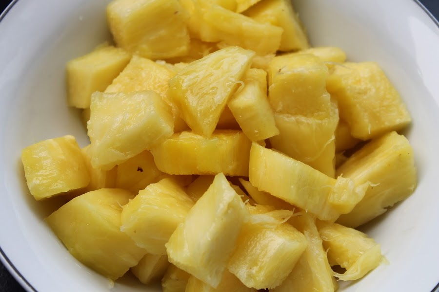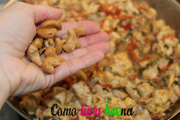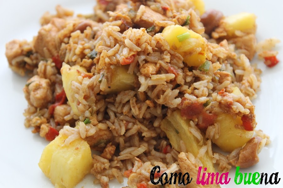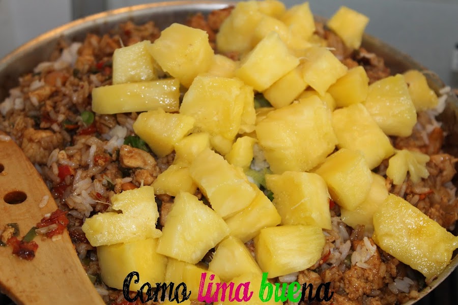 Rociar con la salsa de soja y el jugo de media lima. Mezclar. Por último, incorporar la piña.