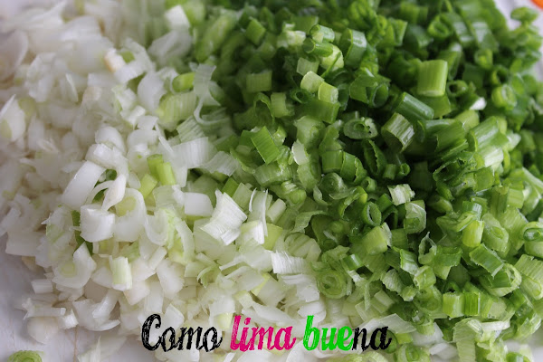 Lavar y picar la cebolla china, el morrón, el ajo y el pimiento chile. Reservar.