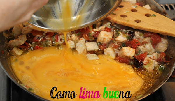 En la misma sartén, verter los huevos previamente batidos y cocer.