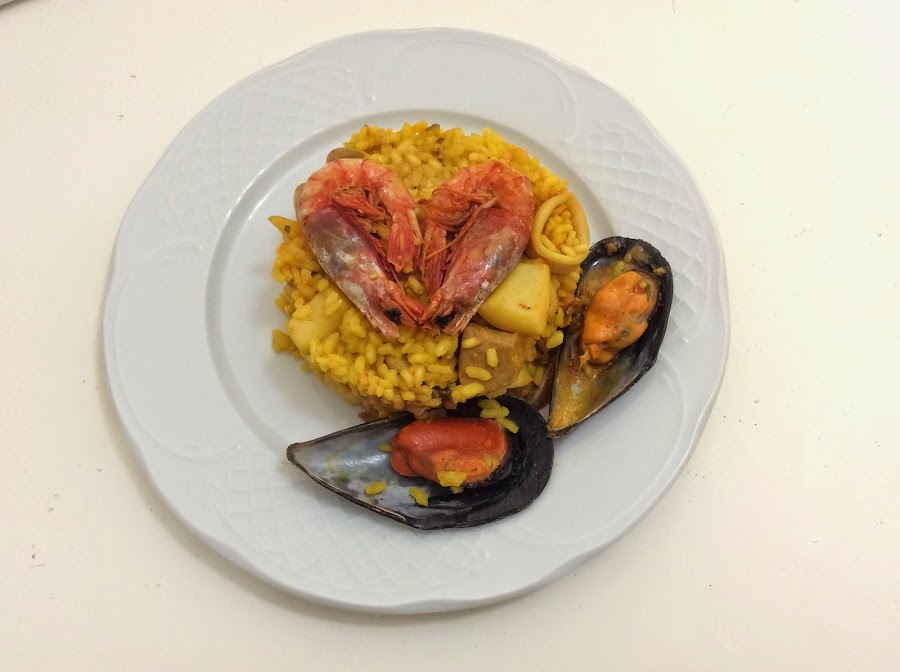 e) Añadimos el agua de cocción de los mejillones una vez colada junto con el resto del caldo a utilizar (nosotros en este caso hemos aprovechado un caldo de cocer camarón pero puede ser caldo de pescado) A continuación añadimos colorante alimentario si queremos que el arroz tenga el color amarillo característico, ponemos los mejillones que habíamos abierto previamente y rectificamos de sal. Taparemos y programaremos el "audiotherm" 25 minutos en función cocer "zanahoria", ponemos el fuego al máximo y cuando la franja roja llegue a dicha función y nos avise bajamos el fuego y esperamos esos 25 minutos.