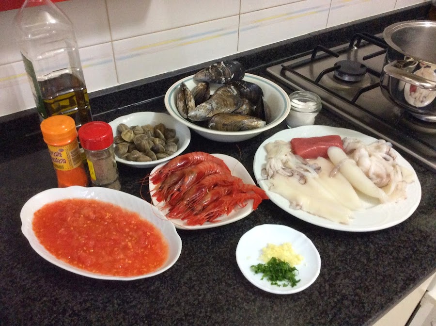 Lo primero que haremos es limpiar bien los calamares y la sepia así como cortarlos en anillas y trozos pequeños respectivamente; el tomate lo rallaremos y reservaremos, así como el ajo y el perejil finamente picado.