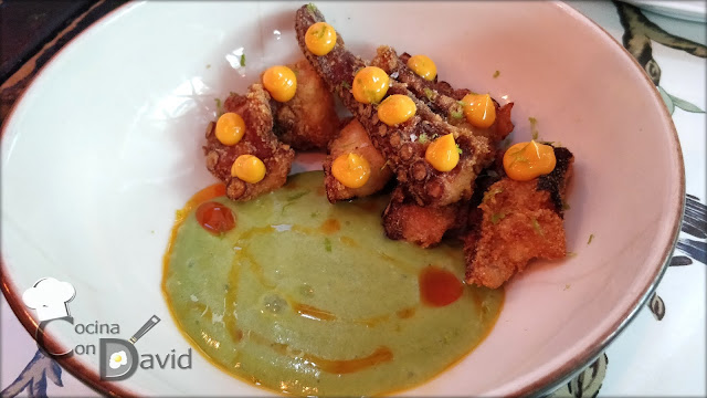 Continuamos con el Pulpo crocante, acompañado de una espuma de patata, Codium que le aporta ese característico sabor a mar y la ajada. Una forma diferente de comer el pulpo, crujiente por fuera y tierno en su interior. Un plato buenísimo que me encantó.