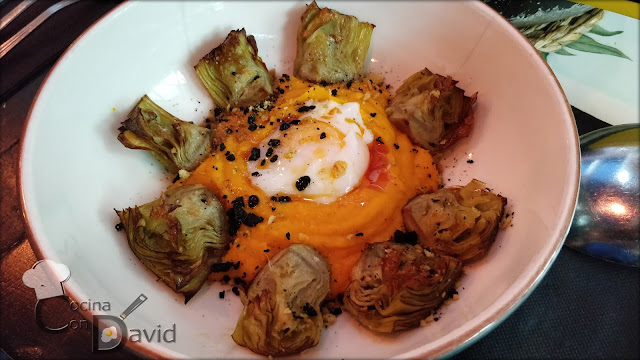 "Alcachofas confitadas, crema de tubérculos , tierra de aceitunas y huevo poché"
