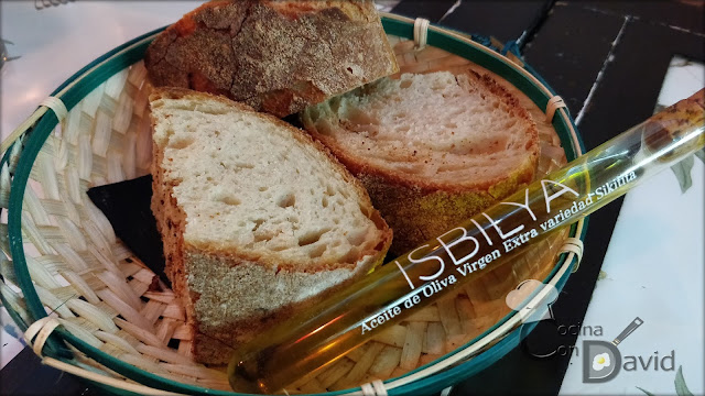 Empezamos con el pan, hogaza típica gallega con mucha miga y corteza crujiente. Lo acompañan con aceite de oliva virgen extra. Muy rico